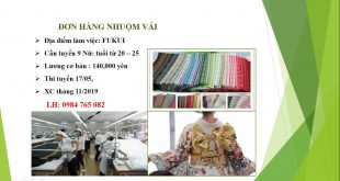 Đơn hàng NỮ Nhuộm vải tỉnh FUKUI (sản xuất, kiểm tra SP vải), Lương cơ bản 14Man, thi tuyển 17/5. Công ty đang có 8 TTS đang làm việc THÔNG TIN ĐƠN HÀNG Lịch thi tuyển: – Hạn nộp hồ sơ: 12/05/2019 – Ngày thi tuyển: 17/05/2019 – Xuất cảnh: …